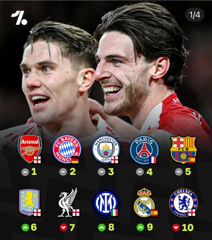 数据公司OPTA发布了最新的球队战力实时排行榜!
